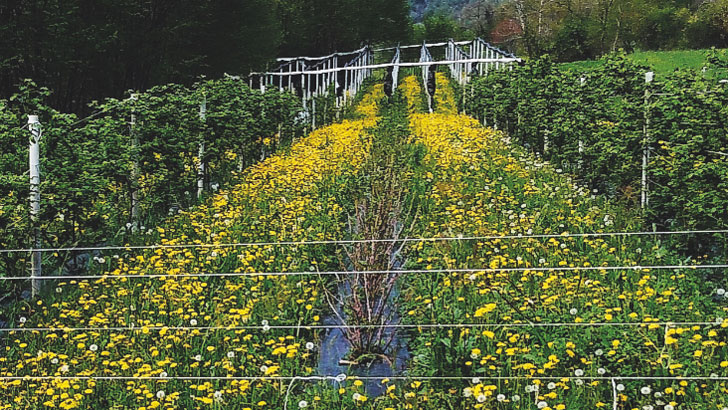 Negli altri frutteti abbiamo adottato la tecnica della pacciamatura sulle fila in modo da ridurre l’impatto delle infestanti e per mantenere il più possibile l’umidità nel suolo. Nell’interfilare, invece, tutti i nostri frutteti sono inerbiti con prato stabile che viene trinciato regolarmente favorendo la degradazione spontanea dell’erba in concime organico.